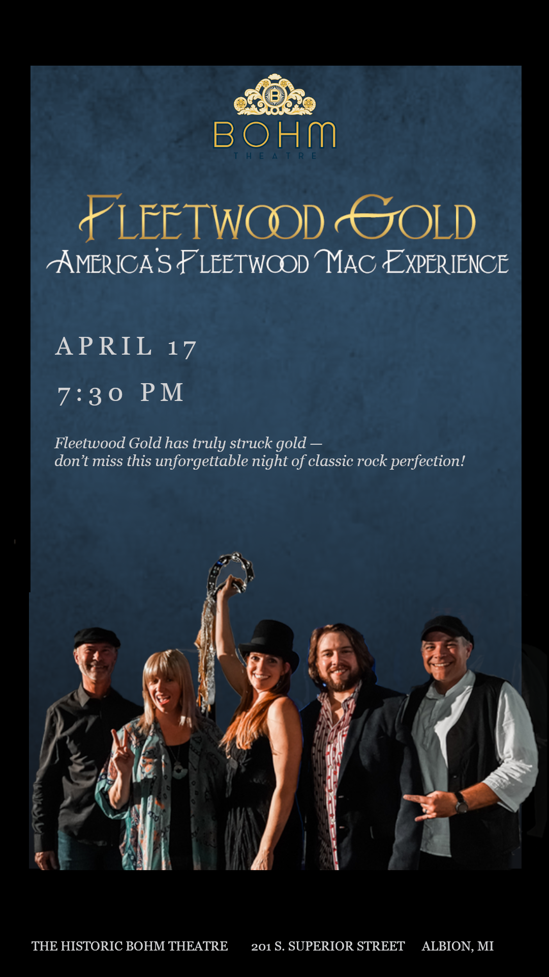 Bohm Theatre 201 S. Superior St, Albion, MIFleetwood Gold - America's Fleetwood Mac Experience APRIL 17 | 7:30 PM With over 23,000 social media followers you don’t want to miss the tribute event that’s captivating audiences and selling out venues everywhere it goes! “Fleetwood Mac created some of the most enduring music of the ‘70s and ‘80s—from their #1 hit, […]